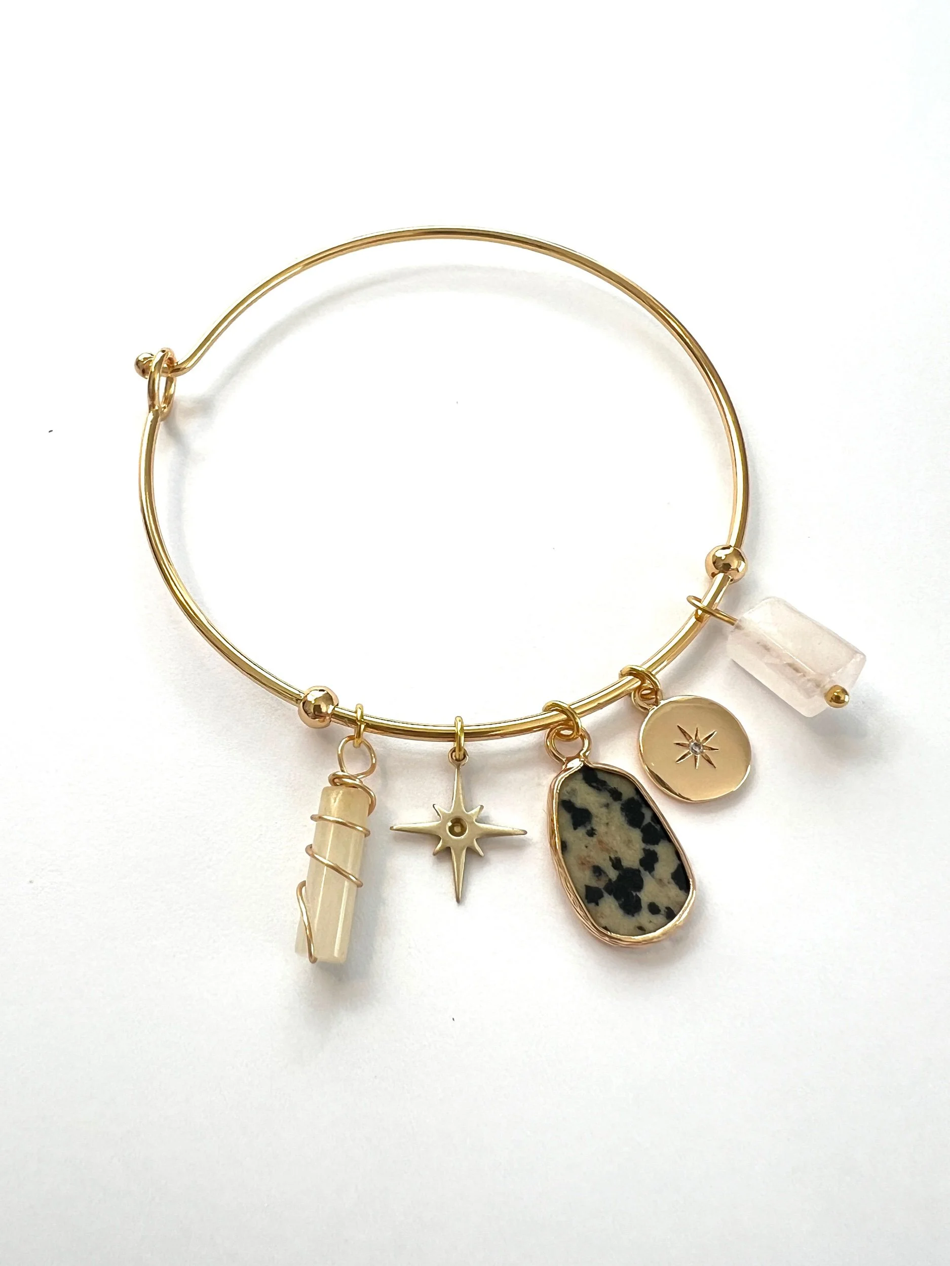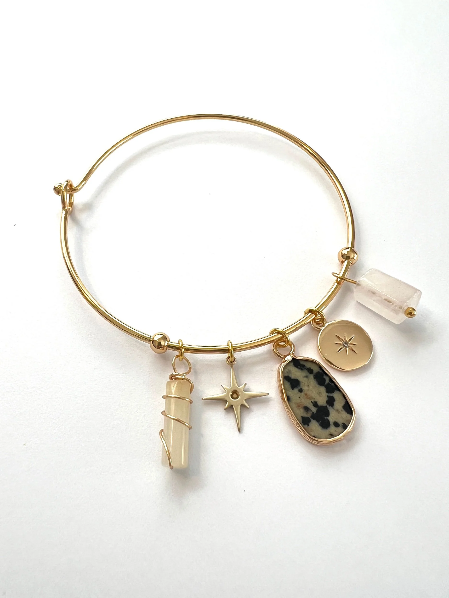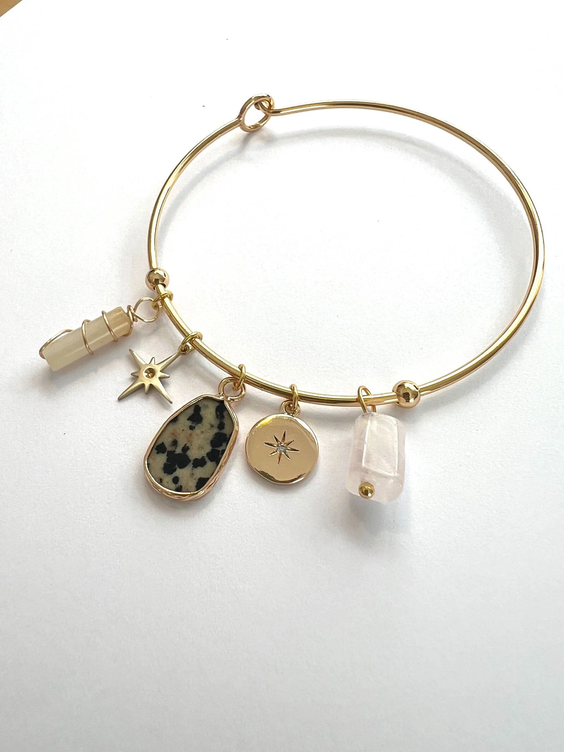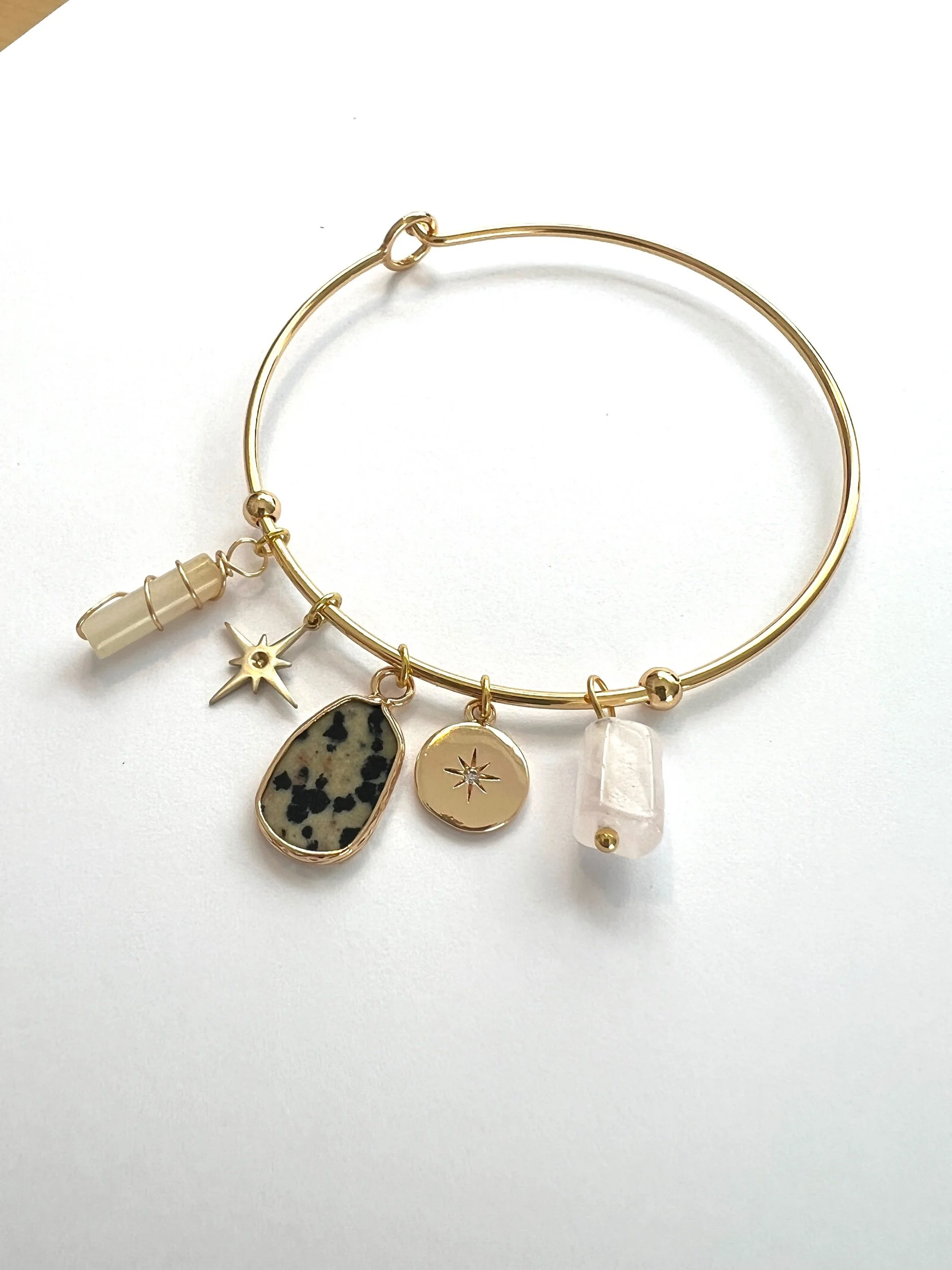 These charm bangles feature a mix of charms and semi precious stones on a gold plated bangle.